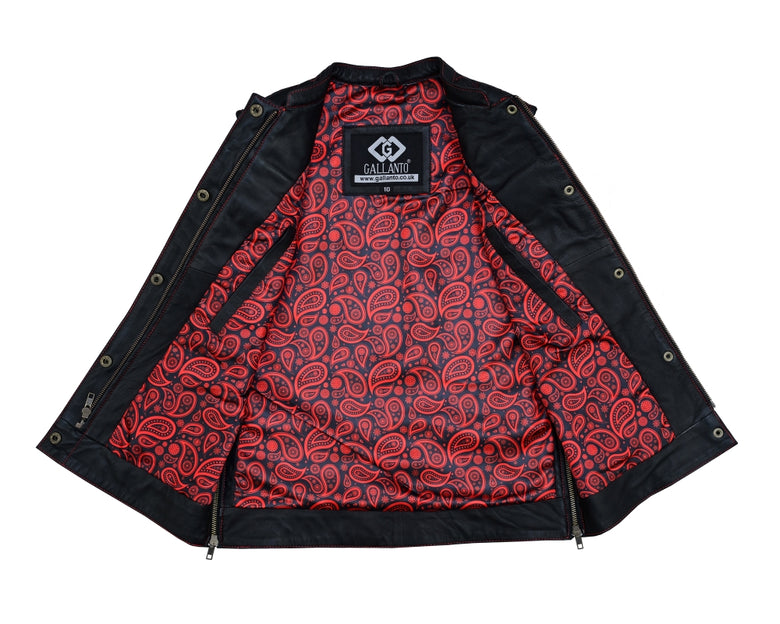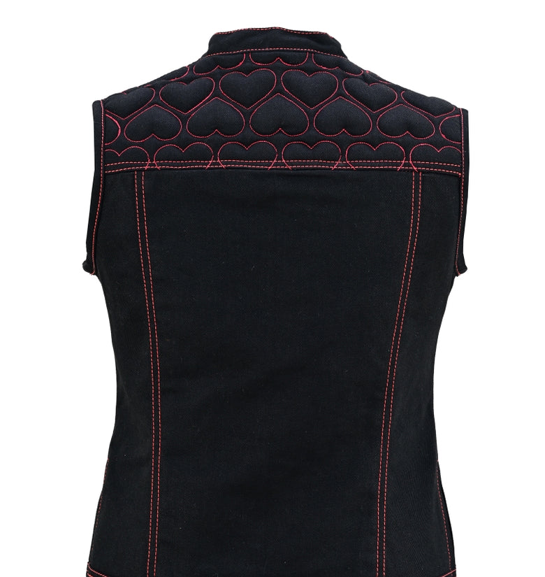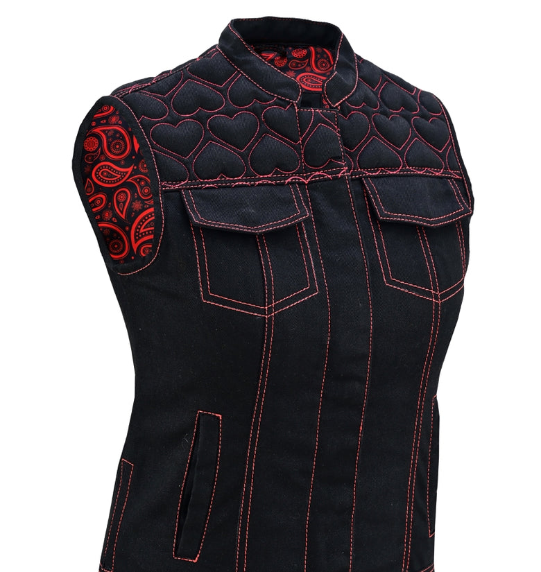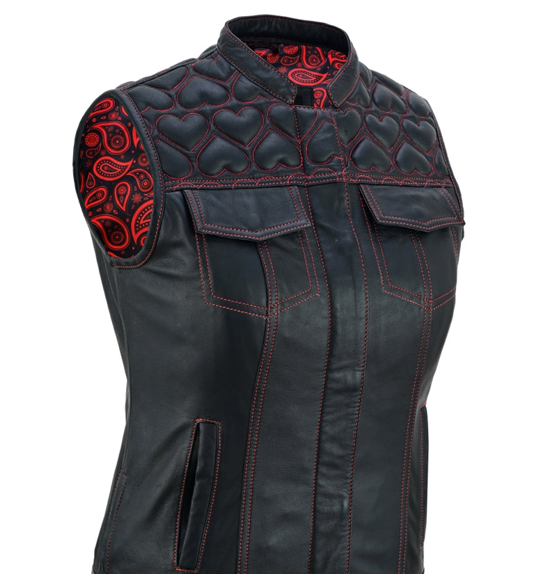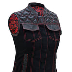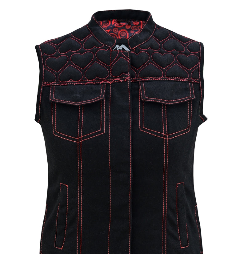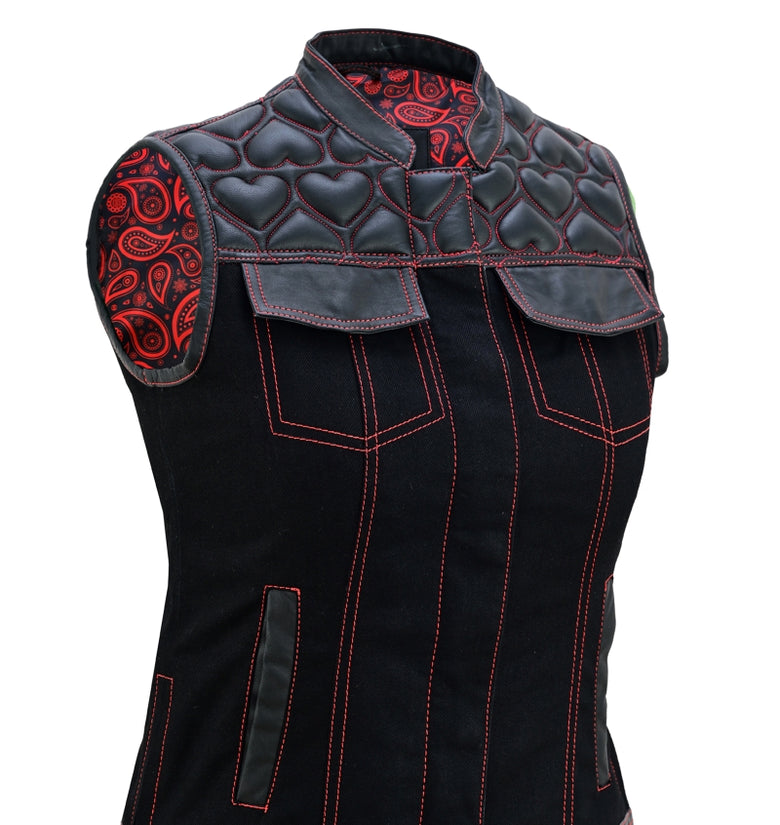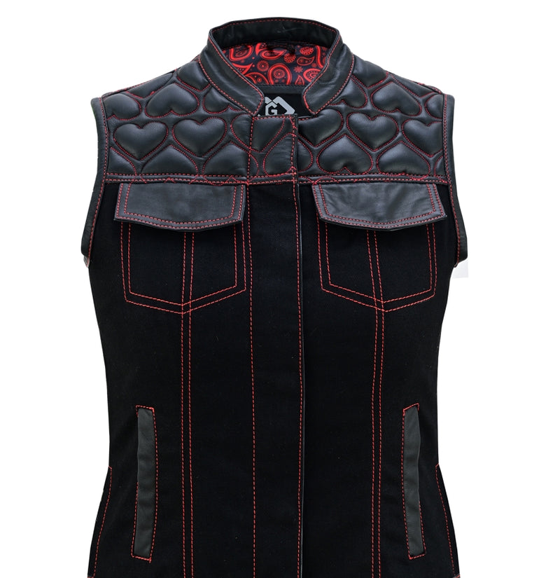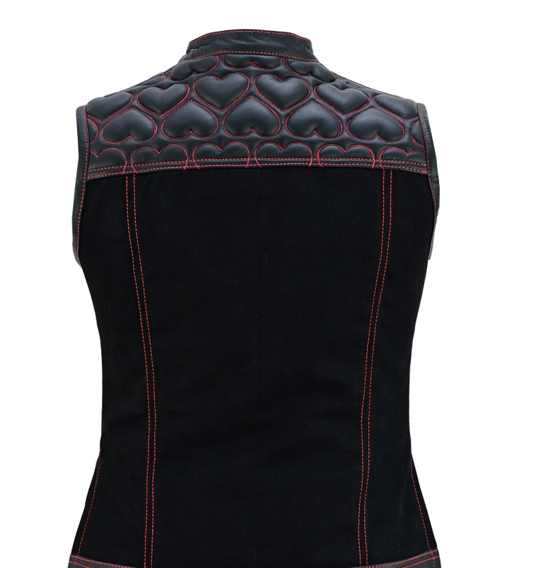 Unleash your bold biker spirit with this Women’s Heart Design Biker Vest, available in Leather, Denim, and Leather & Denim combo. Crafted for style lovers and riders alike, this waistcoat features red contrast stitching, padded heart panels, bandana satin lining, and secure dual closures. A perfect mix of rebel attitude and feminine flair for the open road or street fashion.